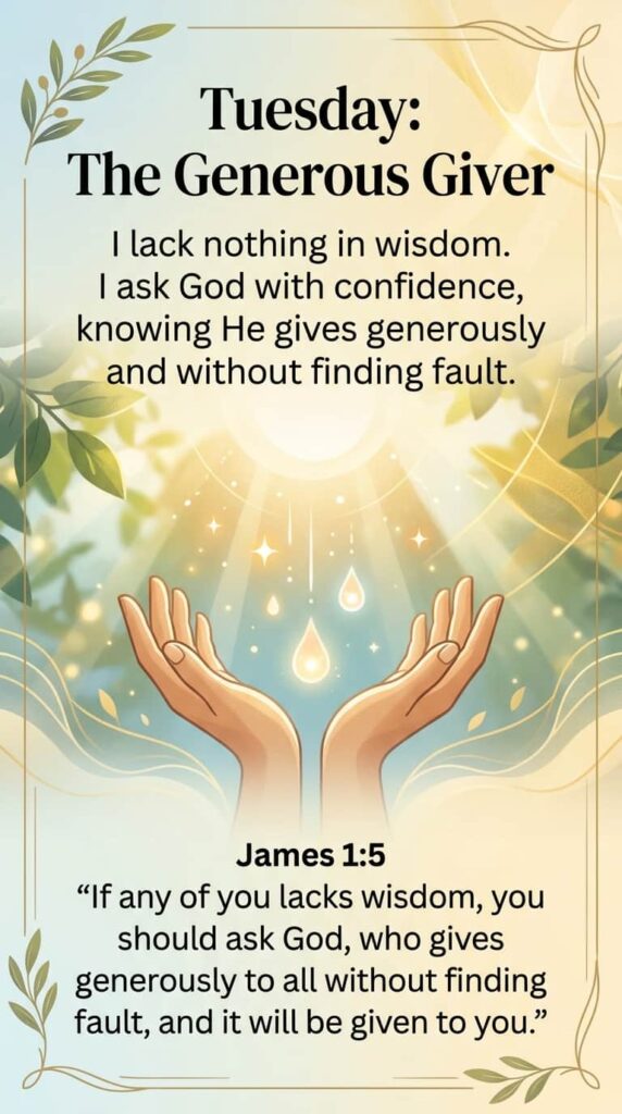 I lack nothing in wisdom. I ask God with confidence, knowing He gives generously and without findng fault.
